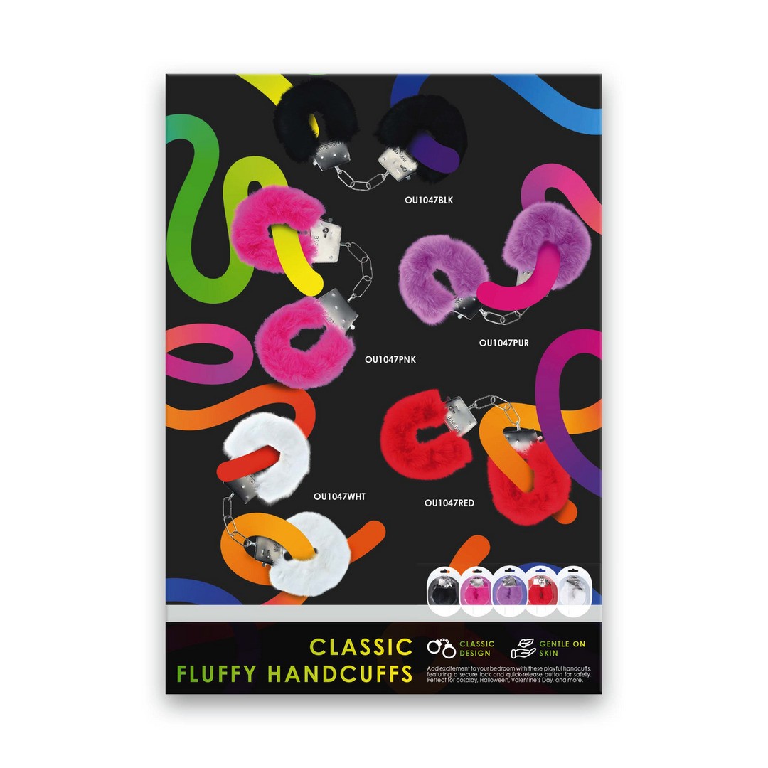 Infografía Classic Fluffy handcuffs (OU1047BLK - OU1047PNK - OU1047PUR - OU1047WHT - OU1047RED) en inglés.