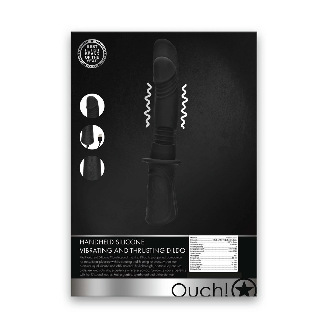 Infografía Handheld silicone vibrating and thrusting dildo (OU951BLK) en inglés.