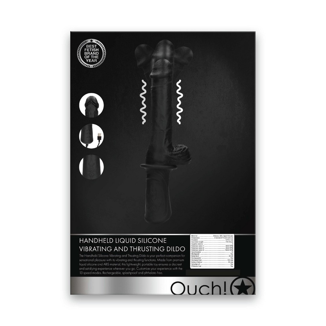 Infografía Handheld liquid silicone vibrating and thrusting dildo (OU952BLK) en inglés.