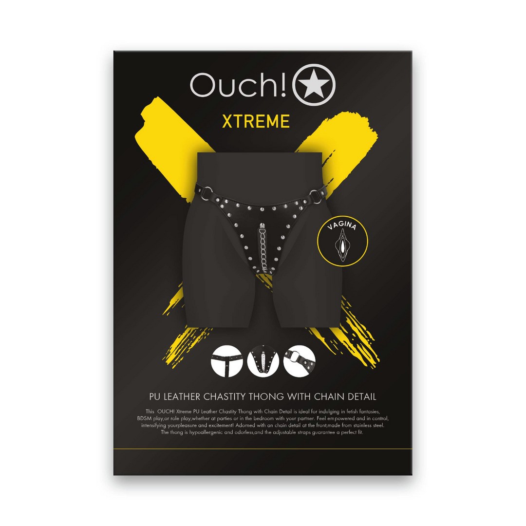 INFOGRAFÍA PU LEATHER FEMALE CHASTITY BELT WITH LEG RESTRAINT XTREME OUCH!