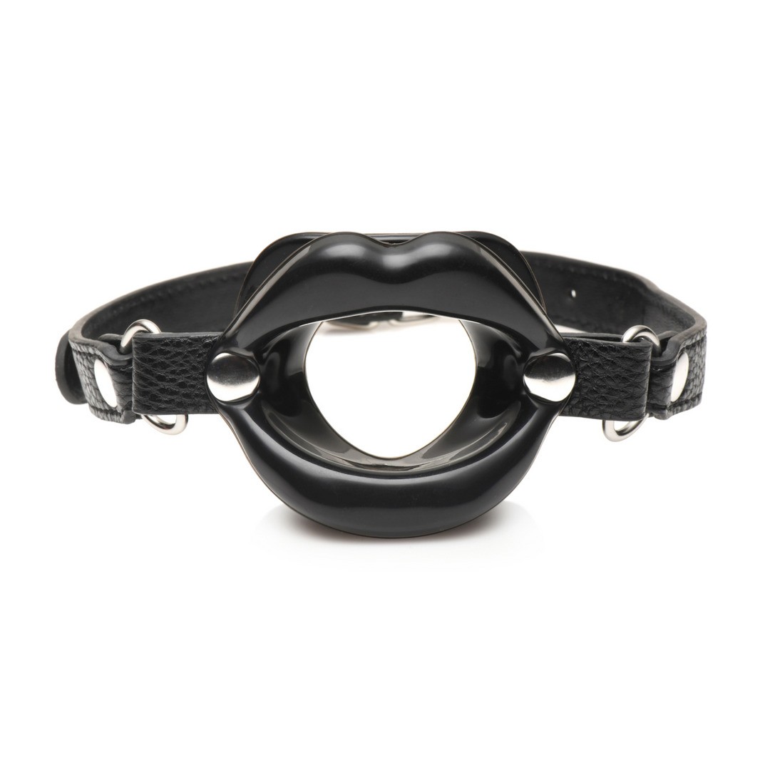 Mordaza de boca abierta con labios grandes, correa ajustable y diseño hipoalergénico en piel vegana para juegos intensos.