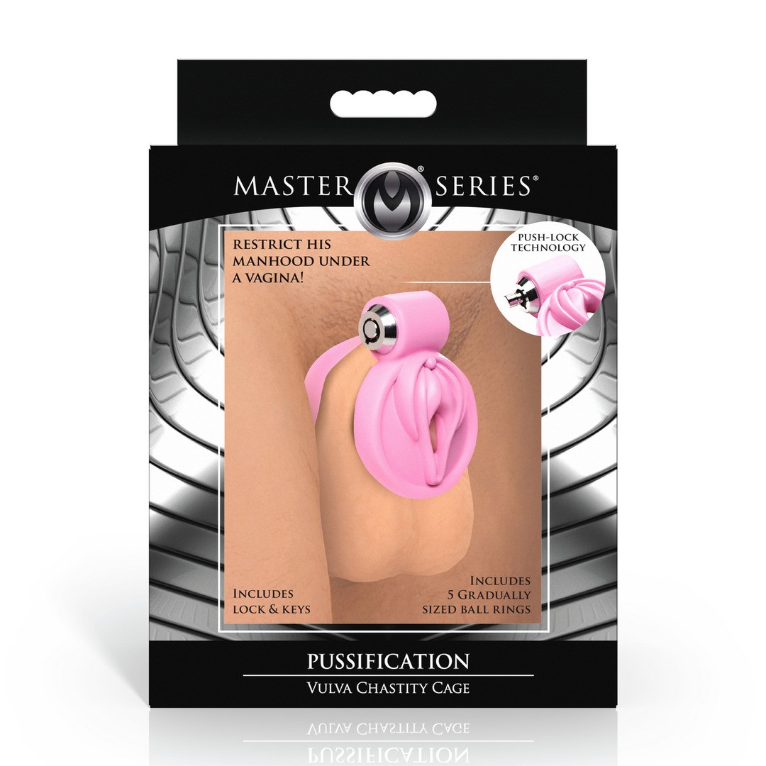 Jaula de castidad metálica feminizante, con tapa en forma de vulva y anillos ajustables para una sujeción segura.