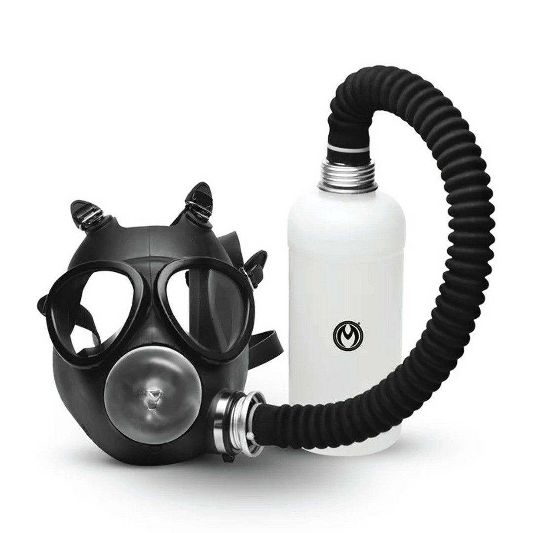 Máscara de gas erótica con válvula unidireccional, manga masturbatoria y frasco de aroma para un juego de respiración intenso.