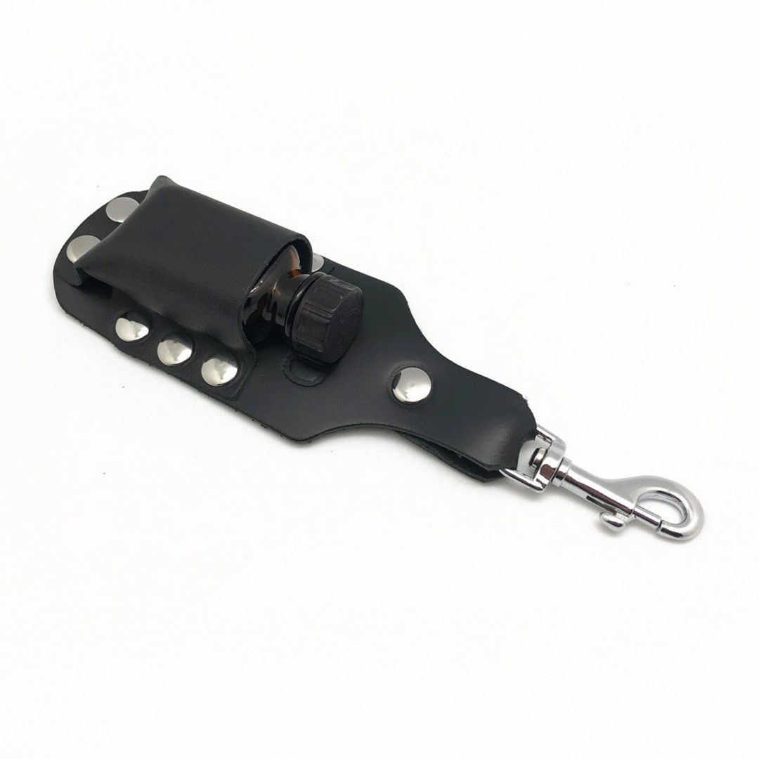 Soporte de cuero para frascos de limpieza de cuero de gran formato (24 y 30 ml), ideal para tener siempre a mano tu aroma. Se puede enganchar fácilmente al cinturón, al arnés u otros accesorios gracias al resistente mosquetón metálico.