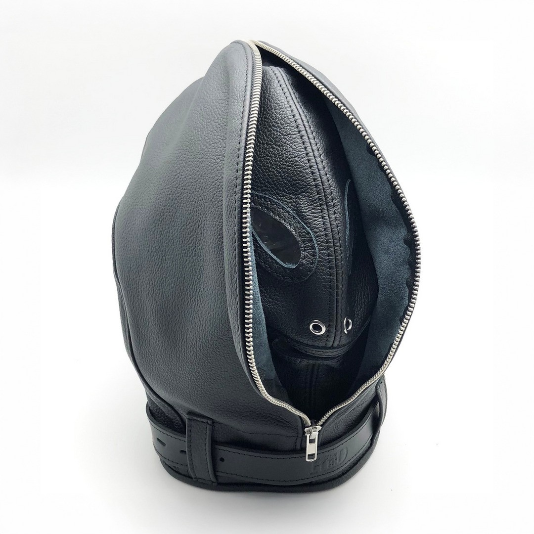 Capucha de privación sensorial Balaclava de cuero negro de primera calidad, fabricada en Europa, para experiencias intensas, elegantes y envolventes.