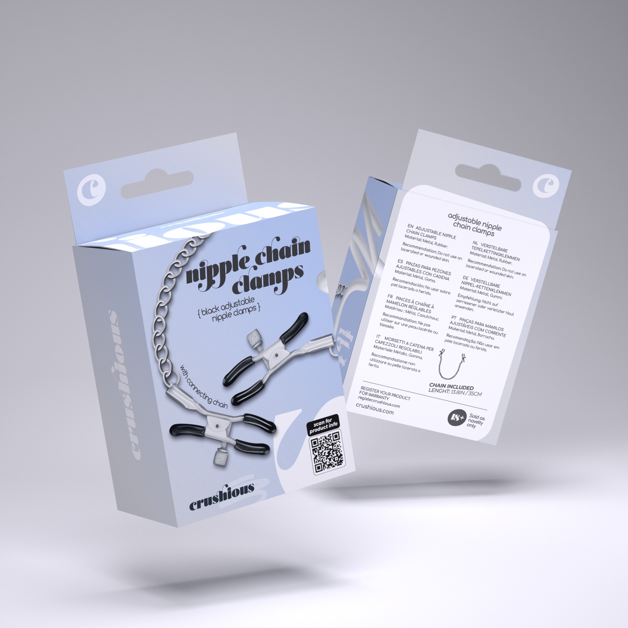 La chaine permet un peu de jeux de poids et une caresse froide unique, et les pinces adaptables fournissent différents niveaux de pression. Tout ceci grâce aux Silver Nipple Chain Clamps de Crushious !