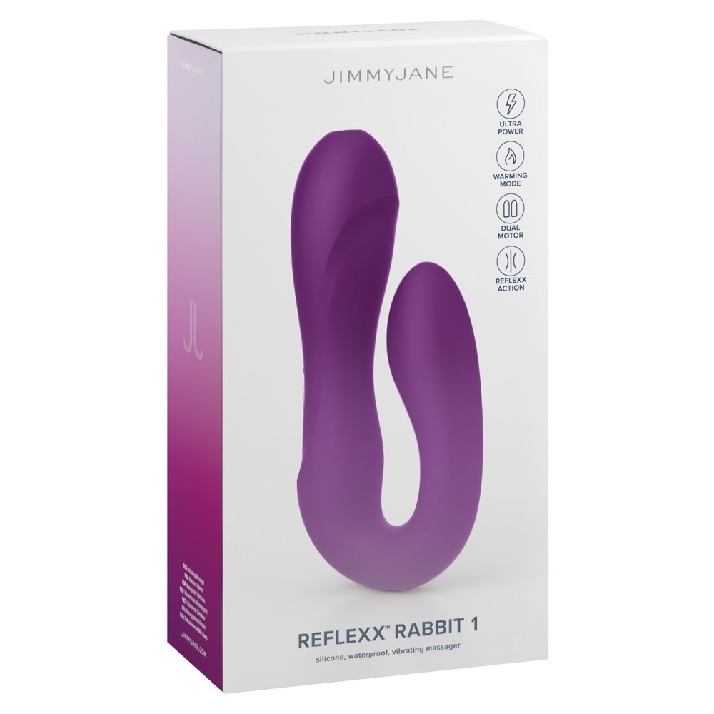 Le vibrateur double Reflexx Rabbit 3 flexible de JimmyJane est conçu pour une double stimulation du vagin/point G et du clitoris. Sa forme en U, avec un rebord flexible, s'adapte parfaitement au corps et aux mouvements pendant la stimulation. Sa douceur offre une pression idéale pour que les vibrations puissantes soient ressenties de manière intense, tant à l'intérieur qu'à l'extérieur.