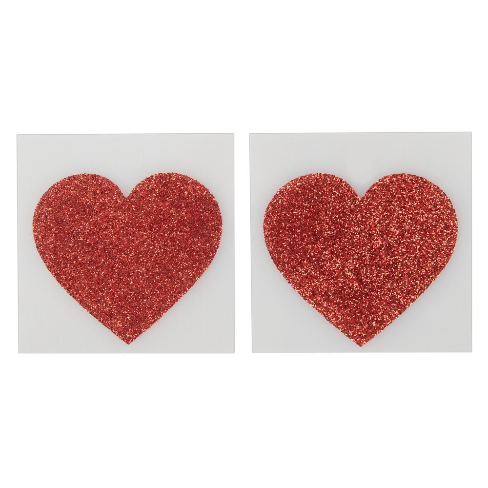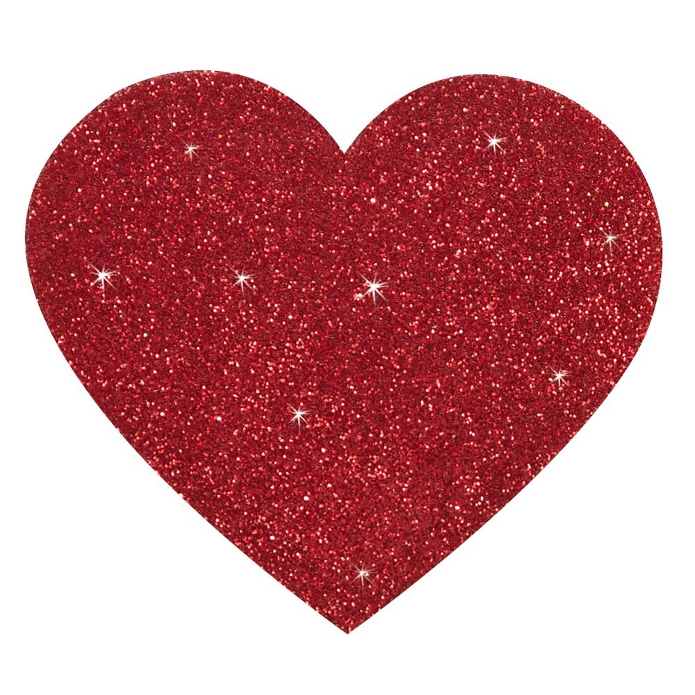 Autocollants de téton en forme de cœur, rouges et étincelants. Il y a des bandes adhésives au dos.