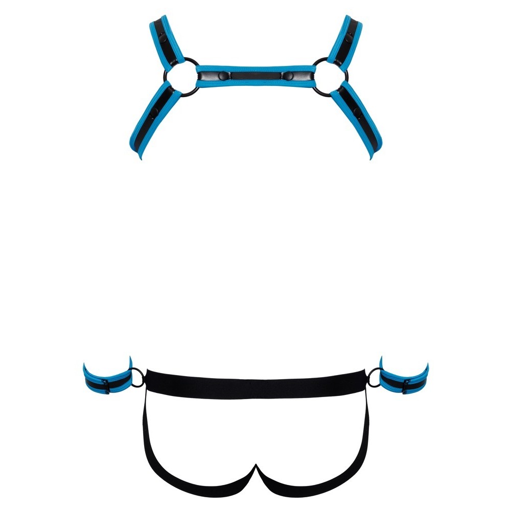 Ensemble Svenjoyment Bondage au look saisissant en néoprène noir rehaussé de détails bleu roi, composé d'un harnais, d'un jock et de 2 menottes. Le harnais s'enfile et s'enlève facilement grâce à ses boutons-pression. Le jock est doté d'une fermeture à glissière sous le sac et d'une conception ouverte dans la partie inférieure, créant un effet provocant. La ceinture est dotée d'anneaux latéraux pour fixer les menottes incluses, qui sont équipées de fermetures à crochets et boucles réglables pour un ajustement confortable et sûr.