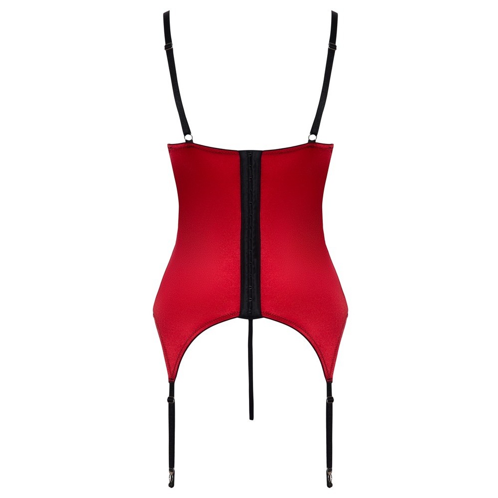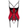 Ensemble composé d'un caraco à bonnets et d'un string sans entrejambe de Cottelli LINGERIE. Fabriqués en satin rouge extensible et ornés de dentelle délicate et d'éléments contrastants en noir. Très doux et extensible pour un grand confort. Le soutien-gorge à balconnet incorporé est rembourré et met en valeur la poitrine, parfaitement encadrée et soutenue par les bretelles et les armatures du bonnet. Des anneaux de strass scintillants entre les bonnets et à l'avant de la ceinture complètent l'ensemble. Les bretelles et les jarretelles sont très élastiques et peuvent être ajustées. Le dos des bretelles de la camisole est muni d'une rangée de crochets et le string assorti est ouvert à l'entrejambe.