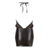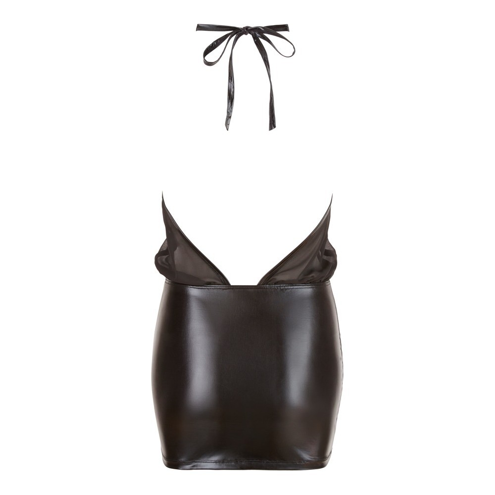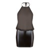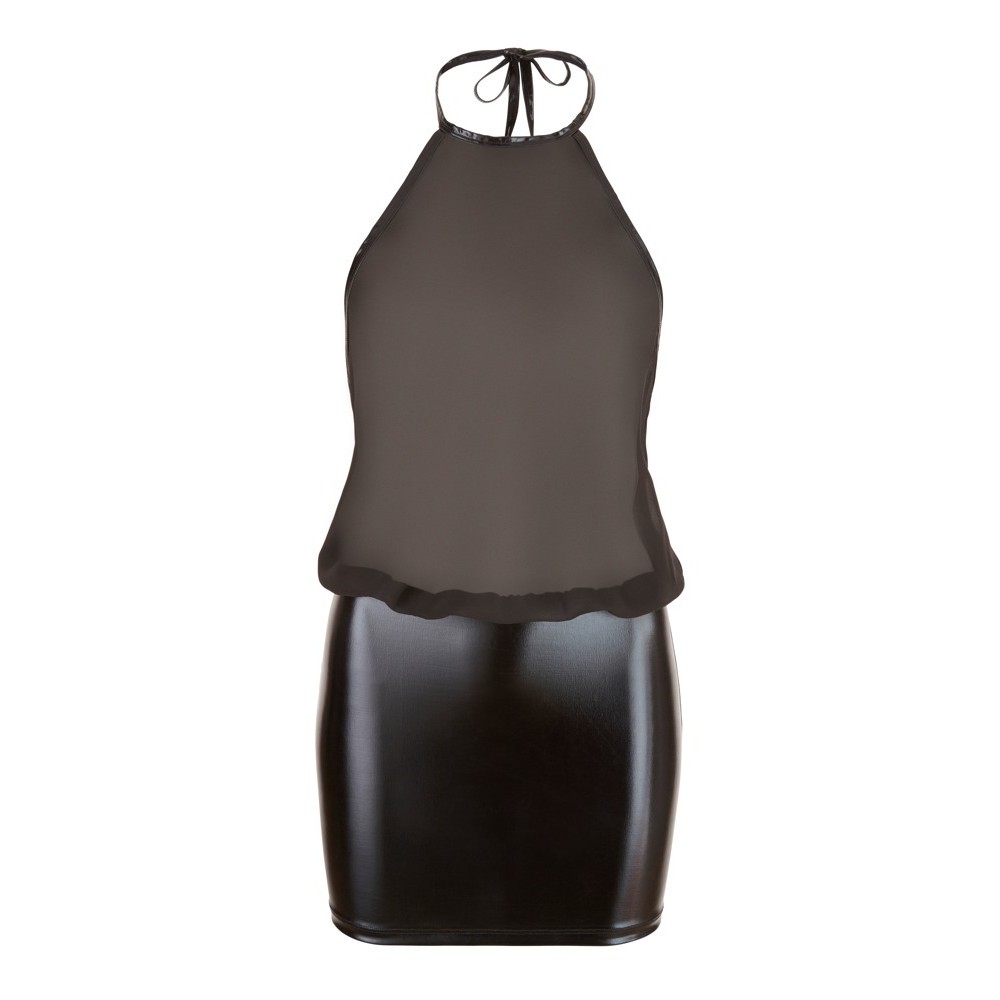 Robe noire sensuelle avec décolleté halterneck qui se noue dans le dos, col haut et dos entièrement dénudé. La jupe en wet look brillant est moulante, tandis que le haut en mousseline transparente crée un contraste élégant et provocant.