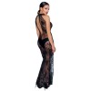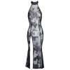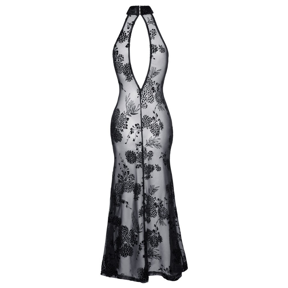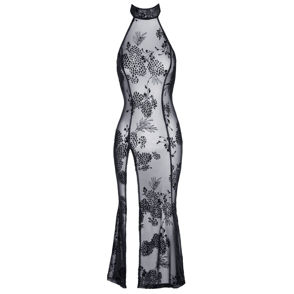 Robe longue sans manches de Noir, entièrement confectionnée en powernet élastique, recouverte d'un délicat imprimé en velours floqué à motif floral. Le modèle est ajusté, avec une fente haute sur le devant de la jambe, un col montant fermé par un bouton dans le dos et une élégante découpe ovale dans le dos.