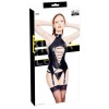 Ensemble de Black Level composé d'une guêpière en vinyle noir et d'un string. La guêpière a une grande découpe sur le devant et un laçage réglable. Dos nu - dos nu avec bouton pression. Elle est dotée d'une fermeture éclair sur le côté, ce qui permet de l'enfiler et de l'enlever facilement. Les 4 bretelles extensibles sont réglables pour un ajustement parfait.