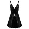 Robe courte de Black Level entièrement en finition vinyle noir. Coupe près du corps avec une jupe évasée. Bonnets élaborés pour un beau décolleté. Les larges bretelles extensibles sur les anneaux décoratifs sont réglables pour s'adapter. Fermeture par bouton pression et zip au dos.