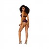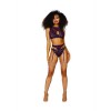 Ensemble 3 pièces en dentelle douce, maille et chaînes dorées amovibles. Le soutien-gorge à col haut, en dentelle et maille sans armatures, présente une ouverture de type "fermeture à clé" sur le devant, avec des chaînes dorées amovibles, des bretelles réglables et une fermeture à agrafes. La ceinture haute à jarretelles est dotée de jarretelles réglables et de chaînes amovibles. Comprend un string en dentelle assorti.