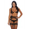 Ensemble 3 pièces avec soutien-gorge en V, porte-jarretelles et string en maille et dentelle délicate.