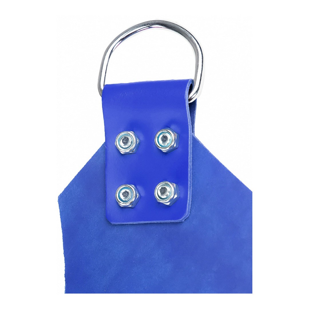 Balançoire rectangulaire en cuir bleu, confortable et résistante, avec 4 points de fixation métalliques.