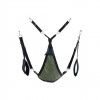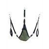 Ce balançoire en tissu vert a été conçu avec une forme triangulaire et un tissu camouflage. Il s'ajuste à l'aide de 3 ou 4 points de fixation. Il comprend les accessoires suivants: 4 crochets avec mousquetons métalliques, des repose-pieds rembourrés (11 cm de large) et un coussin triangulaire noir (24 x 20 cm).