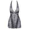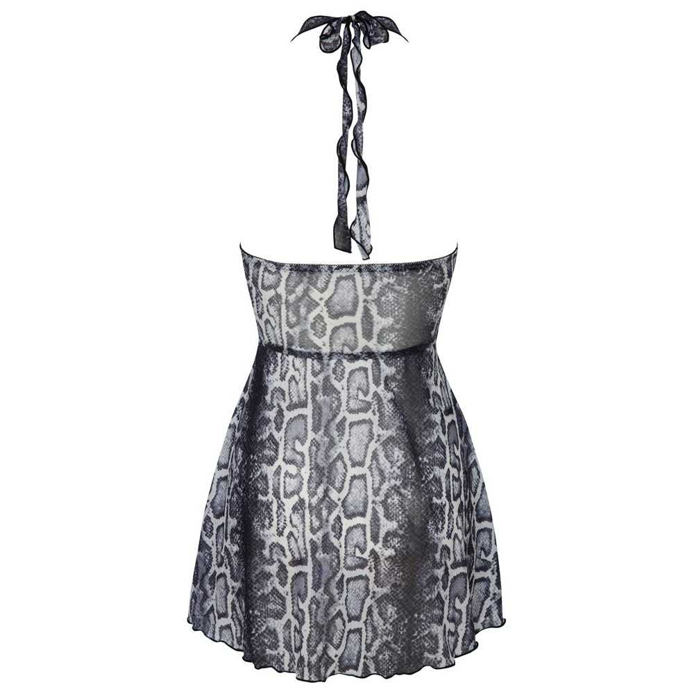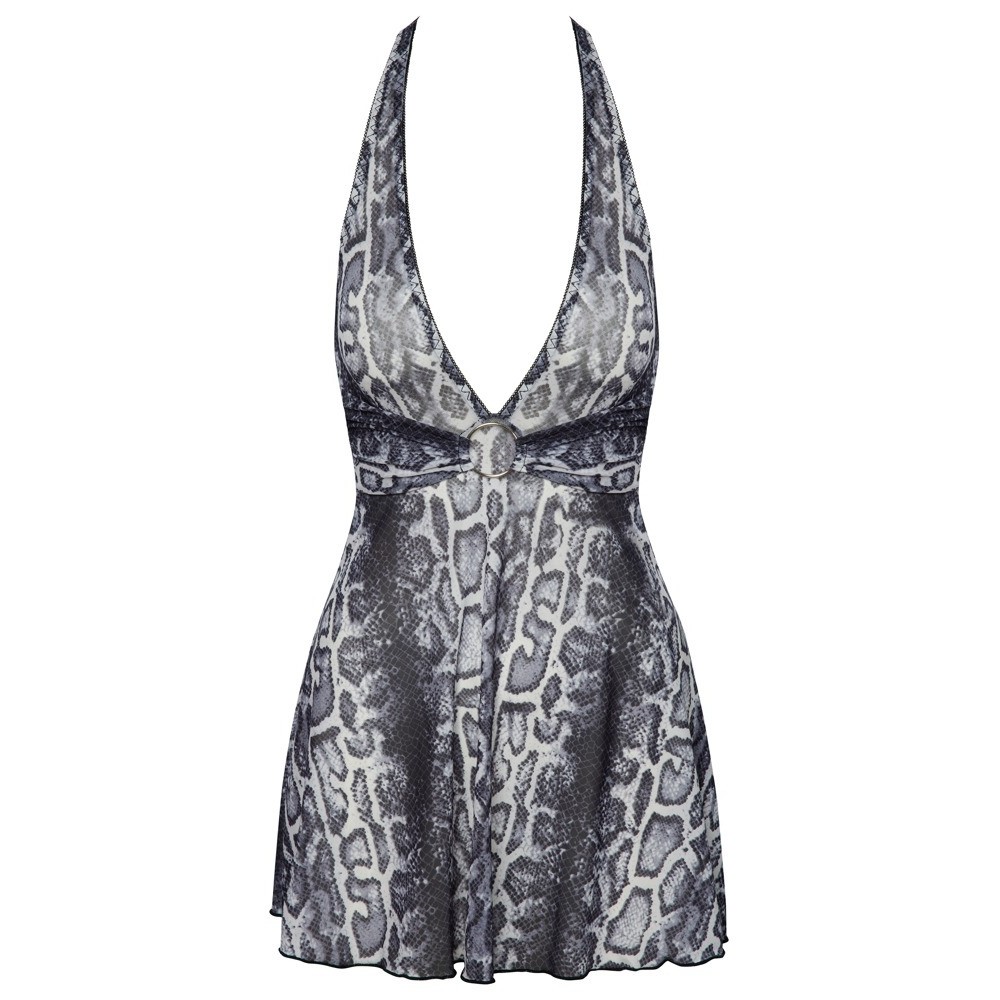 Robe courte légèrement ample de Cottelli LINGERIE au look peau de serpent. Très décolletée. Avec un grand anneau décoratif argenté. Dos nu, se noue dans le cou. Entièrement confectionnée en powernet délicat et transparent avec un motif élaboré.