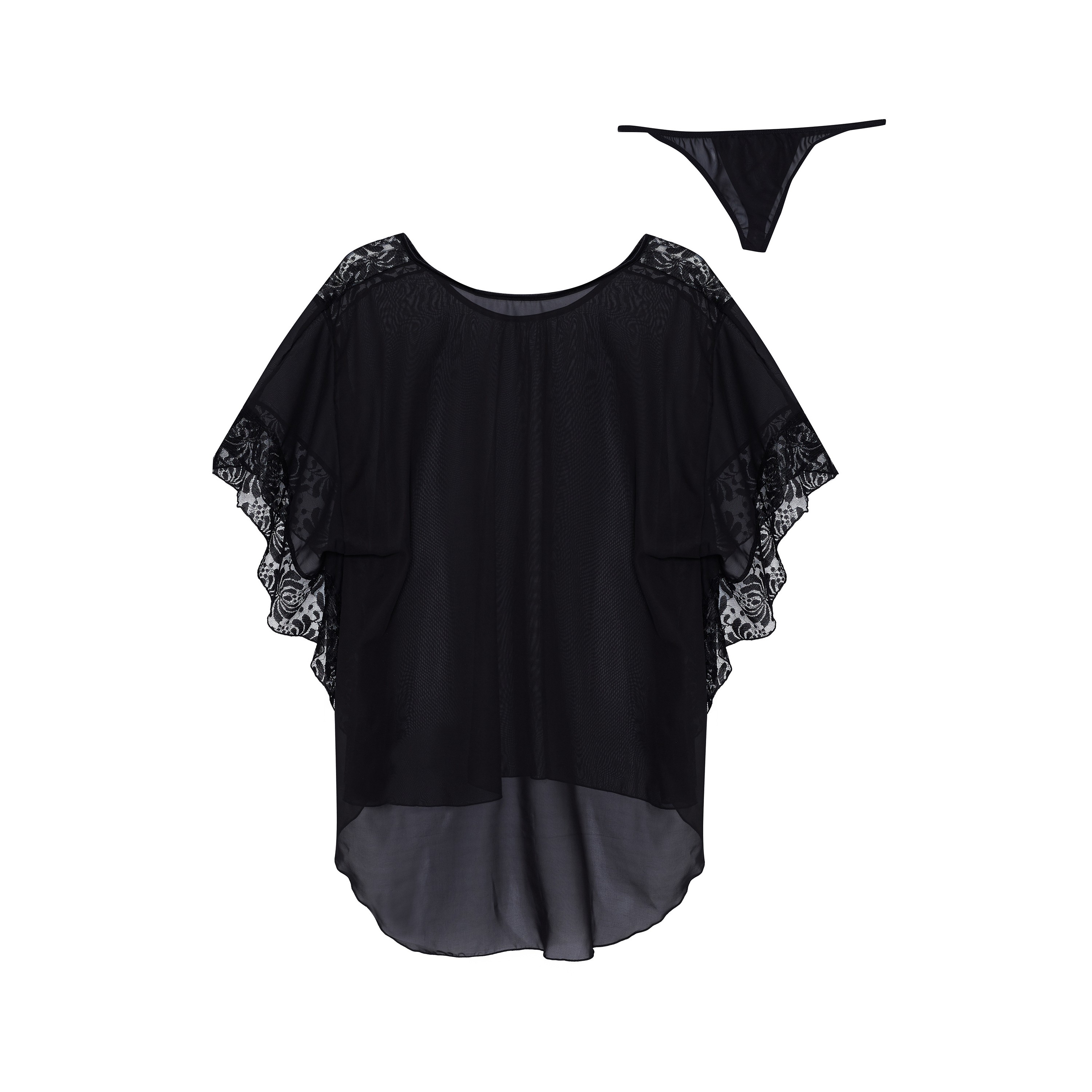 Cette nuisette extrêmement séduisante est fabriquée dans une matière délicate et transparente, avec de la dentelle décorative sur les larges manches.