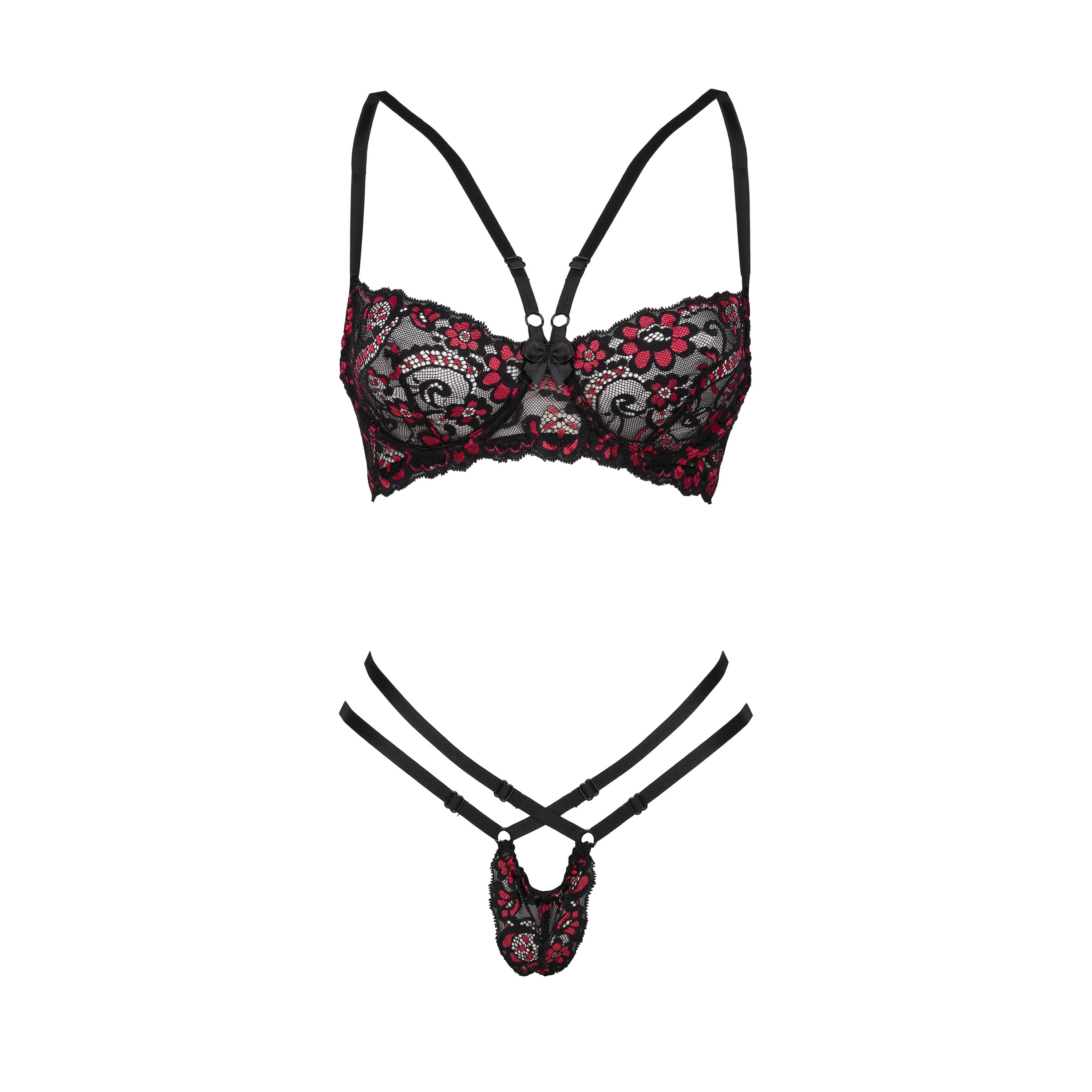 Rosalinda est un ensemble de lingerie en dentelle noire avec des fleurs rouges étincelantes. Cet ensemble met en valeur les courbes des femmes et leur donne confiance en elles.