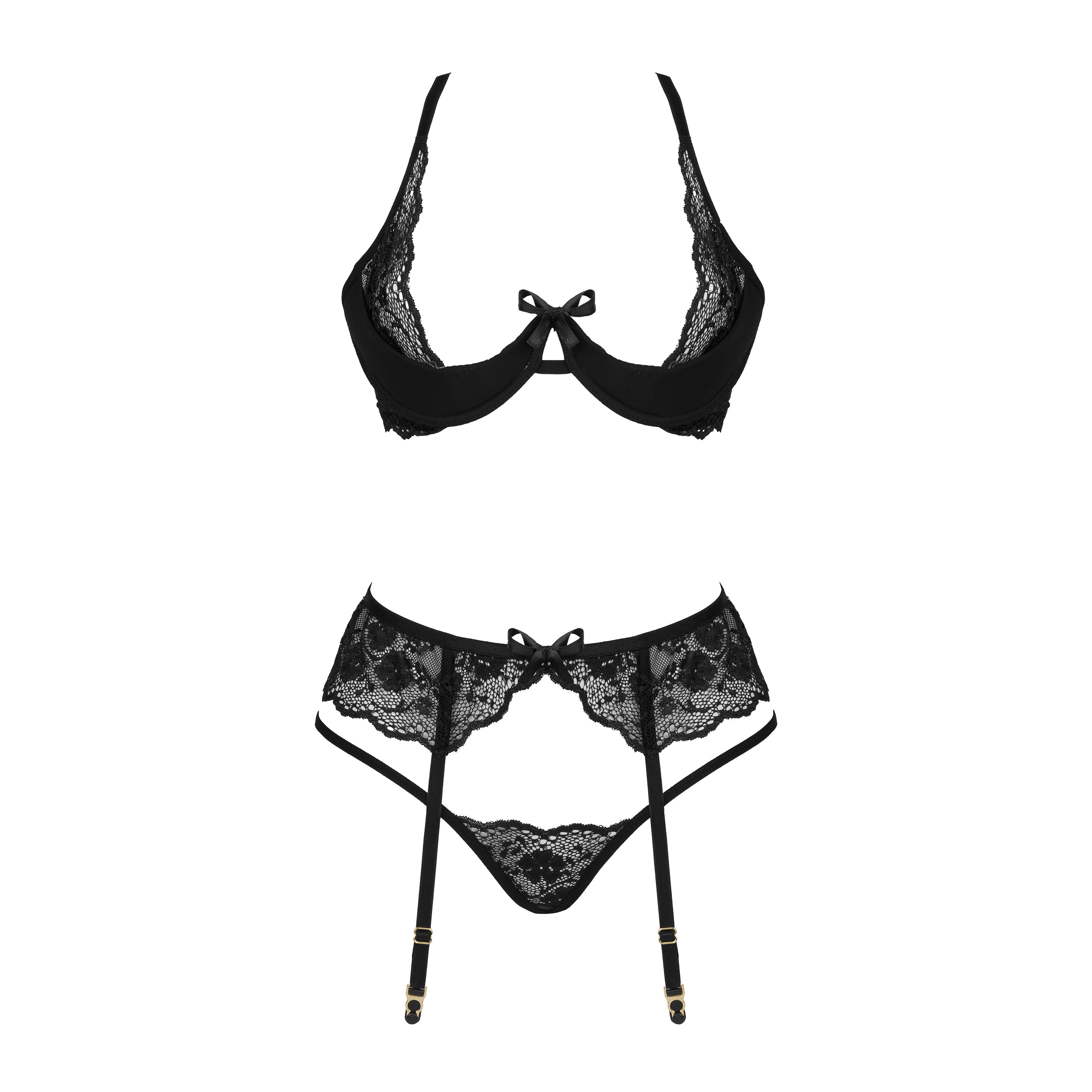 Découvrez le sensuel Rose Set Black, un ensemble de lingerie exquis qui comprend un soutien-gorge, un string et un porte-jarretelles.