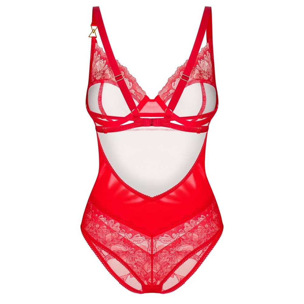 Le body Aliosa d'Obsessive est d'un style séduisant et d'un rouge sensuel. Il est composé d'une belle matière brillante et lisse et d'une dentelle florale délicate et transparente. Il est également doux et extensible pour un ajustement très confortable. Un détail décoratif discret de couleur or se trouve entre les bonnets à armatures et sur l'une des bretelles du soutien-gorge. Les bretelles, la fermeture à crochet à l'entrejambe et la fermeture à crochet au dos peuvent être ajustées.