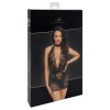 Mini-robe noire transparente de Noir, entièrement confectionnée en tulle élastique délicat avec un imprimé floral velouté. Elle est douce et élastique pour un ajustement parfait et très confortable. Elle est moulante et possède également un col licou et un décolleté très plongeant. Elle est dos nu, mais possède une longue chaîne en strass qui descend jusqu'aux fesses.