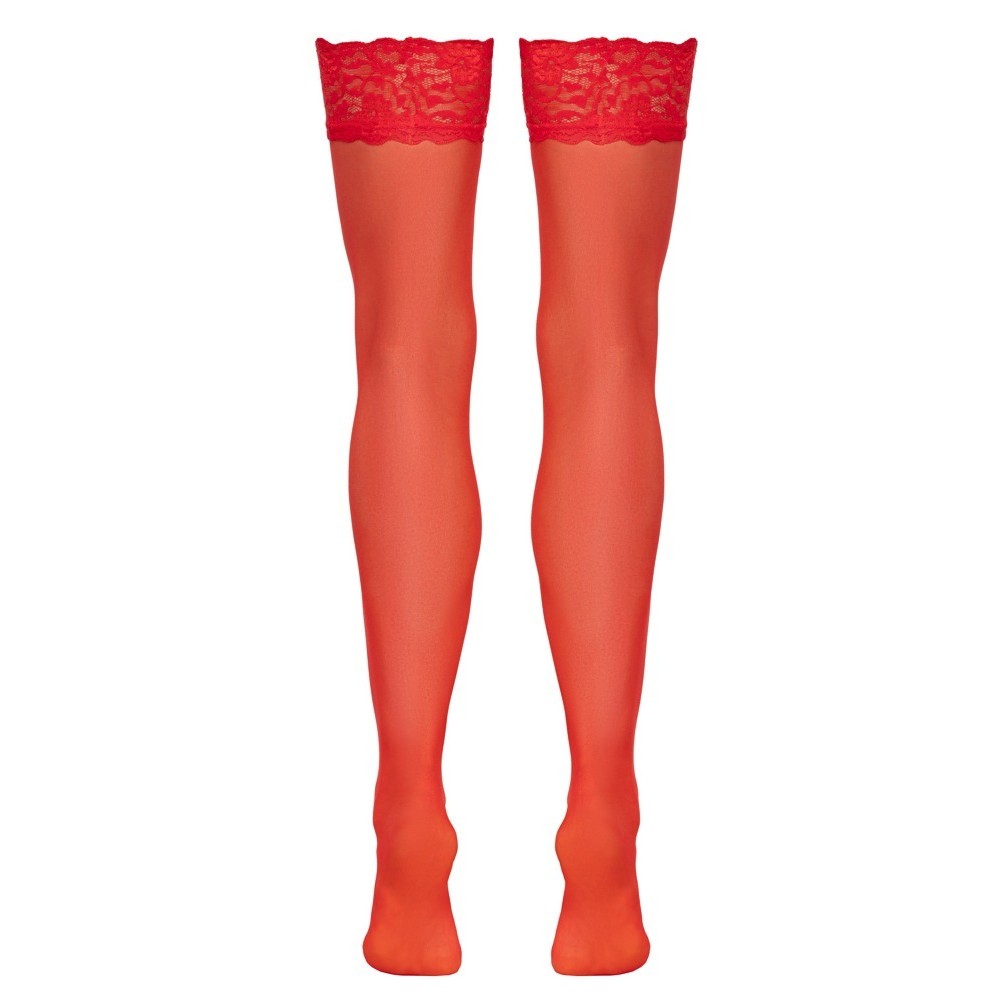 Les bas rouges veloutés de Cottelli LEGWARE sont dotés d'une dentelle extensible de 9 cm de large sur le dessus. 20 deniers. Certifié Oeko-Tex.