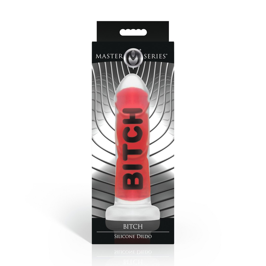 Gode en silicone haut de gamme avec tige nervurée, ventouse résistante et le mot BITCH en relief pour des fantasmes audacieux.