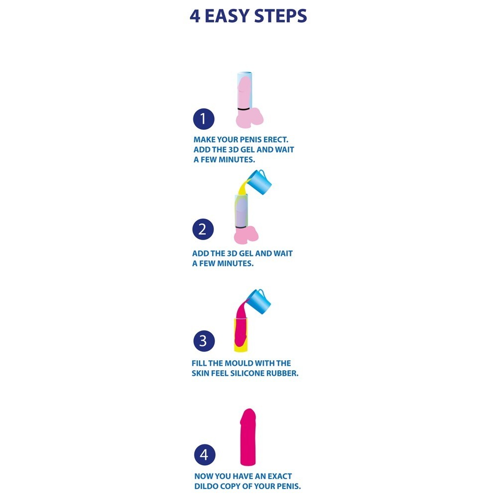 Il kit include: uno stampo (la confezione stessa funge da stampo), una cinghia per il pene, una guaina, un flacone con agente indurente, gel 3D per creare la replica, gomma siliconica, un paio di guanti di plastica, una spatola di legno e istruzioni dettagliate (D, NL, FR, EN).