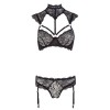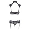 Reggiseno sensuale con ferretto in pizzo floreale, archi decorativi e spalline regolabili sullo scollo. Le spalline presentano delicati dettagli in pizzo che passano sopra la clavicola e si collegano a un ampio collo. Chiusura con gancio sul retro e due bottoni sul collo. Il perizoma in pizzo incluso ha reggicalze regolabili e rimovibili.