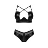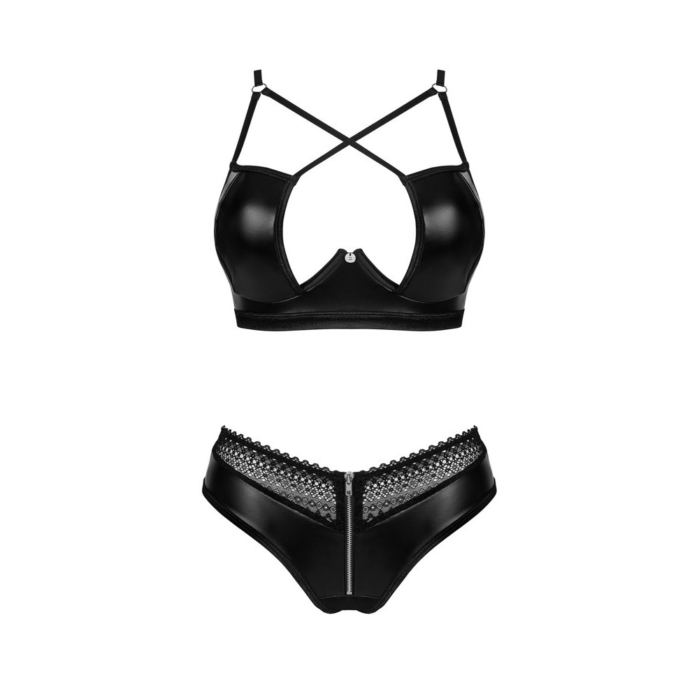 Set nero a due pezzi Norides, di Obsessive, composto da reggiseno con ferretto e perizoma in stile bagnato, elastico e morbido. Il reggiseno presenta un taglio sofisticato, con spalline regolabili e scollatura stravagante, mentre la chiusura a gancio sul retro consente una regolazione personalizzata. Il perizoma seduce con inserti in pizzo in vita e una chiusura frontale con cerniera.