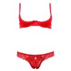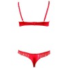 Set in morbido e brillante raso premium, impreziosito da delicati dettagli in pizzo. Reggiseno leggermente imbottito con coppe con ferretto e tanga senza cavallo. Colore rosso.