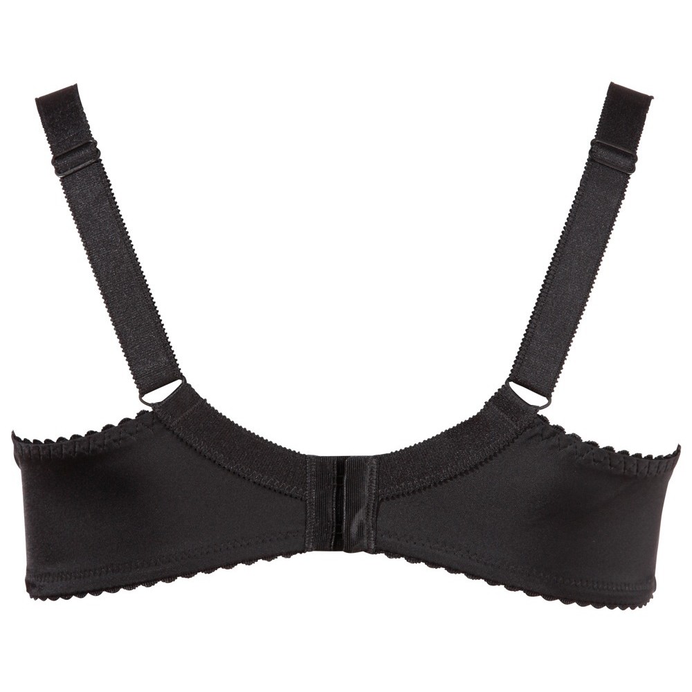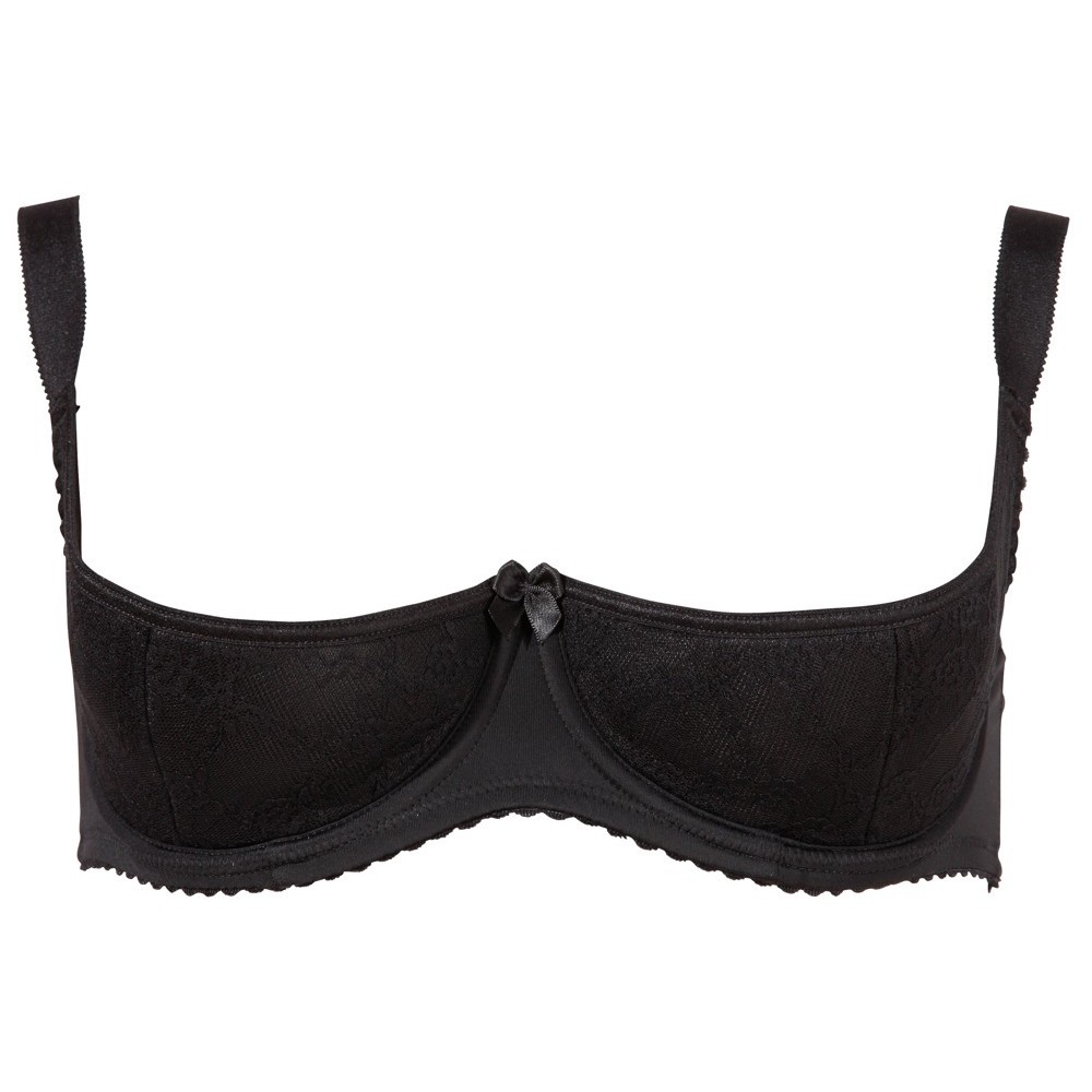 Reggiseno nero a balconcino con ferretto, coppe leggermente imbottite, balconcino laterale e spalline extra larghe regolabili. Il materiale elastico si adatta perfettamente al corpo e valorizza le curve femminili in modo elegante e seducente.