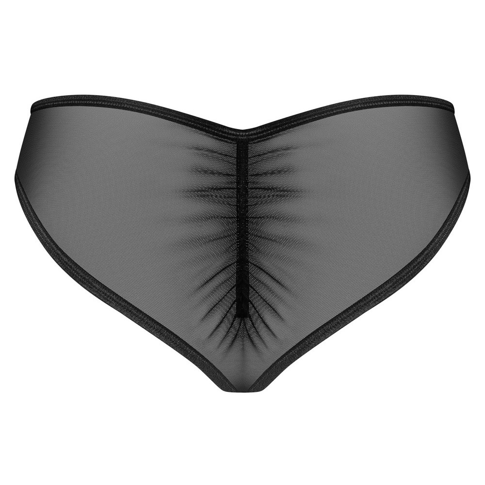 Perizoma Donarella di Obsessive, realizzato in tessuto nero trasparente con un elaborato inserto ricamato e un piccolo elemento decorativo sul davanti. La parte posteriore presenta delicati volant. Il tessuto morbido ed elastico assicura una vestibilità estremamente confortevole per tutto il giorno.