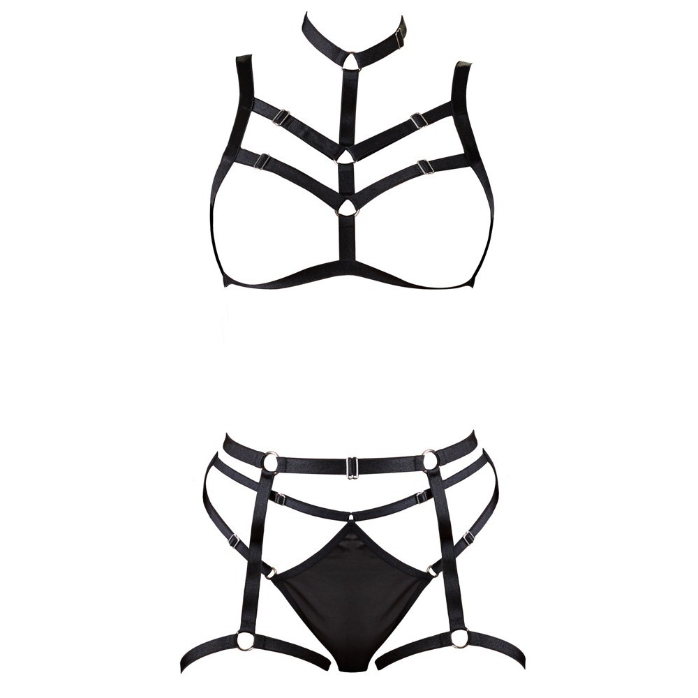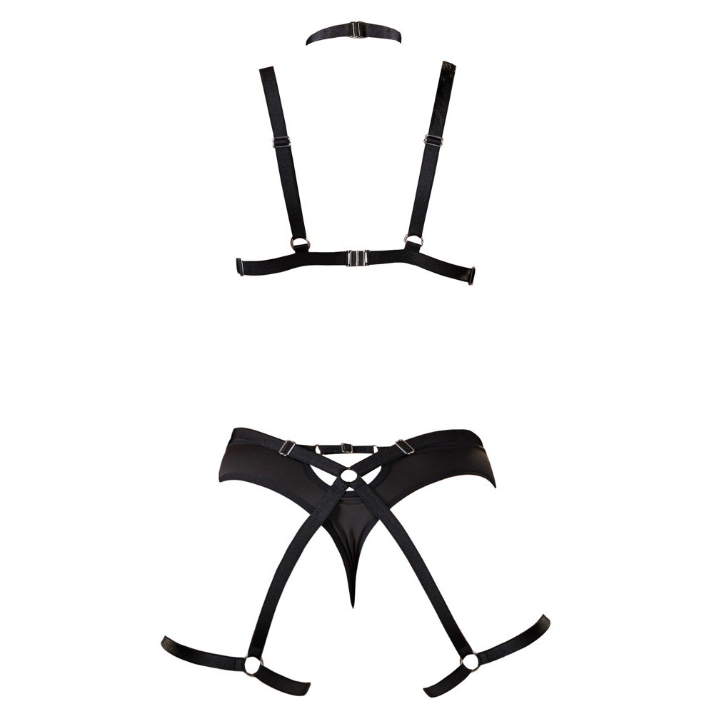 Questo set di 2 pezzi di imbracatura combina eleganza e audacia, emanando una sensuale vibrazione di stile bondage. Realizzato in materiale con spandex, presenta diverse chiusure che consentono una vestibilità comoda e sicura.