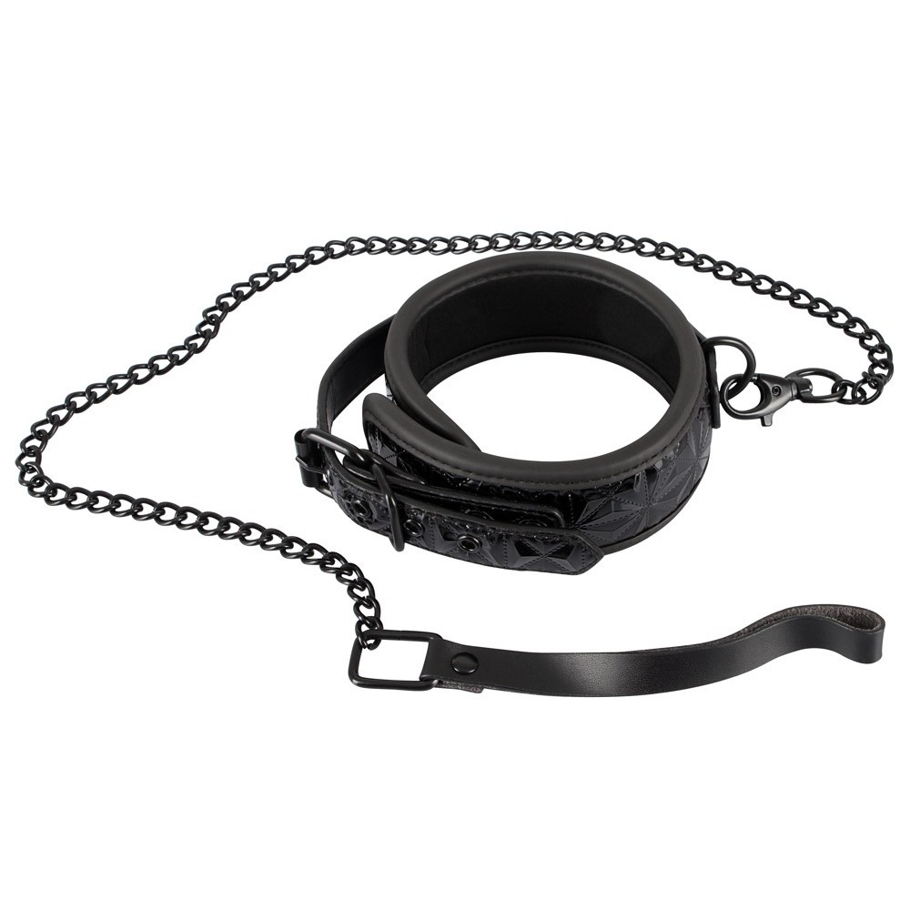 Questo collare nero presenta un motivo a diamante che dimostra un alto livello di eleganza e attenzione ai dettagli. È dotato di un guinzaglio di 88 cm, per un insieme sofisticato e attraente.