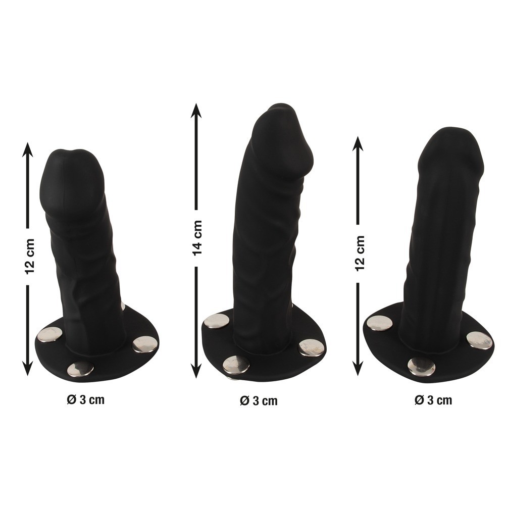 L'imbracatura strap-on di Bad Kitty presenta un elegante design in pelle e include tre dildo in silicone di diverse dimensioni, che possono essere fissati nella parte anteriore o interna tramite bottoni a pressione. Questa versatilità consente di alternare facilmente il dare e il ricevere piacere.
