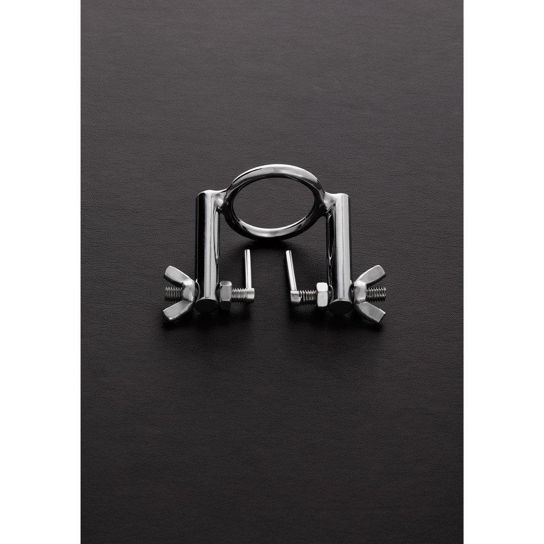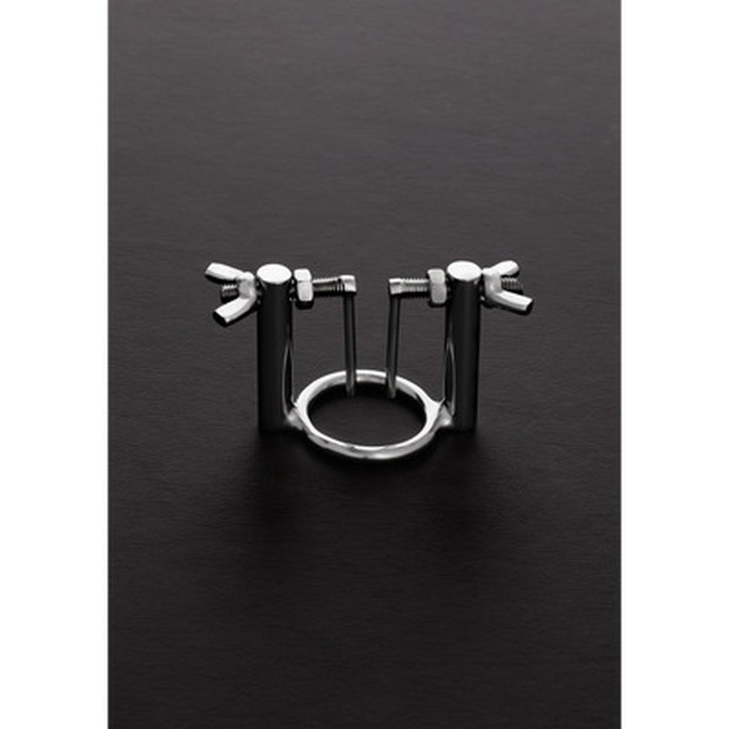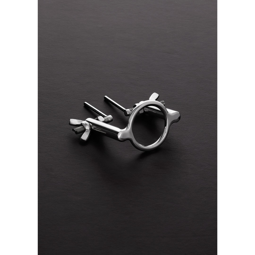 Il dilatatore uretrale in acciaio inossidabile è composto da due aste che si inseriscono nell'uretra, fissate a una struttura collegata all'anello del glande. È sufficiente far scorrere l'anello oltre la testa del pene e utilizzare le due viti ad alette per allargare delicatamente i lati dell'uretra.