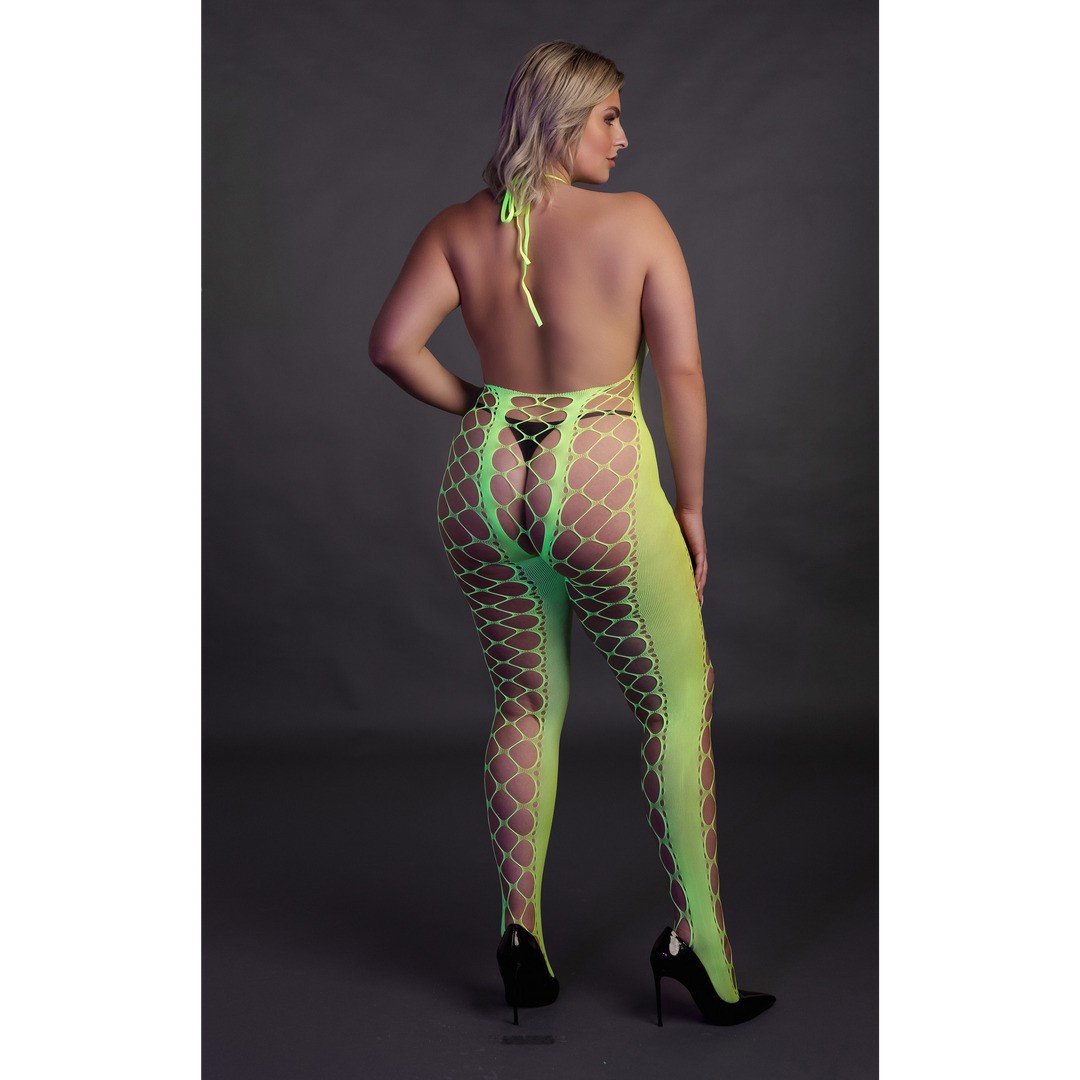 Catsuit Neon UV con scollo halterneck e cavallo aperto, in rosa o verde neon, per un look audace che illumina la notte.