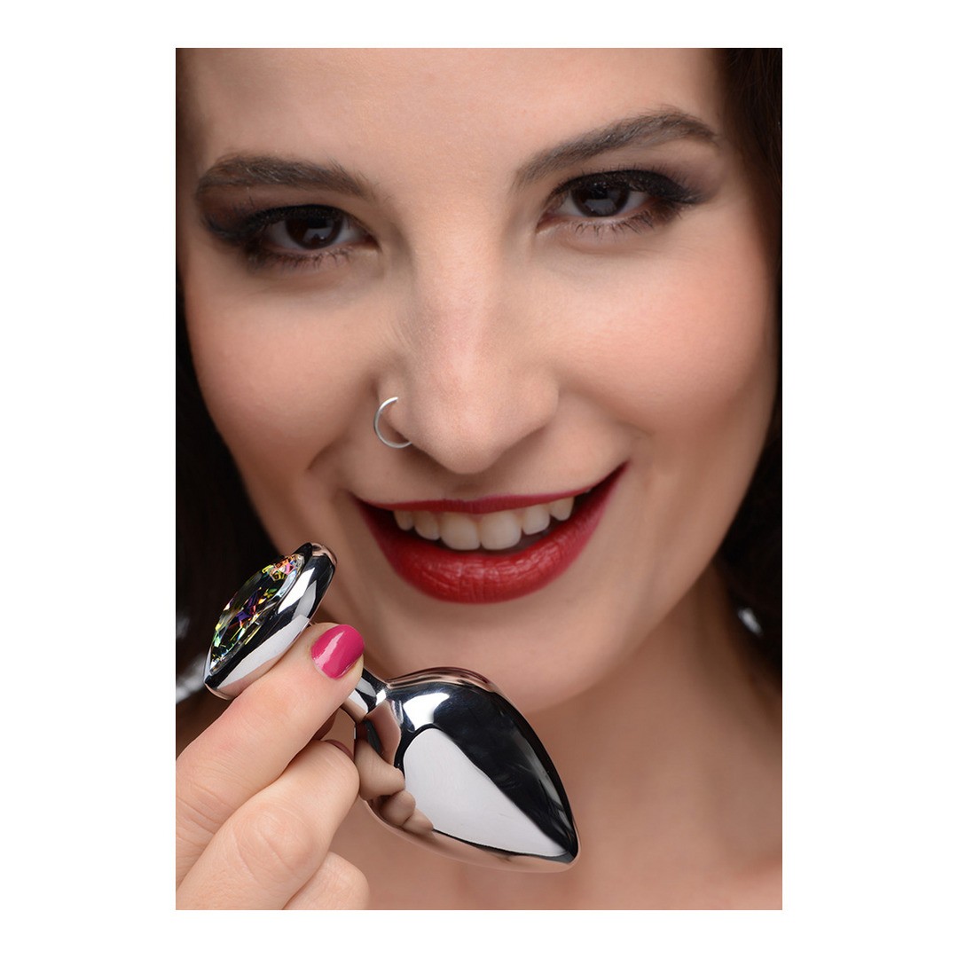 Adorna il tuo fondoschiena con il plug anale Rainbow Prism a forma di cuore! Il gioiello multicolore a forma di cuore conferisce un tocco di lusso e audacia al tuo fondoschiena, mentre le sue dimensioni compatte e il peso soddisfacente rendono questo plug brillante perfetto sia come protagonista principale che per una deliziosa sessione di riscaldamento, ideale per chi ha già una certa esperienza nei giochi anali.