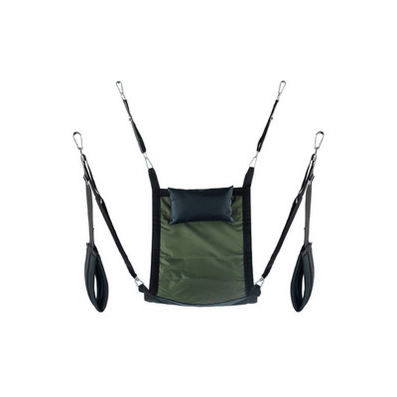 Basculante in tessuto verde con tutti gli accessori inclusi: ganci con moschettoni metallici, poggiapiedi imbottiti (11 cm di larghezza) e cuscino (23 x 38 cm). La fodera è di forma rettangolare.