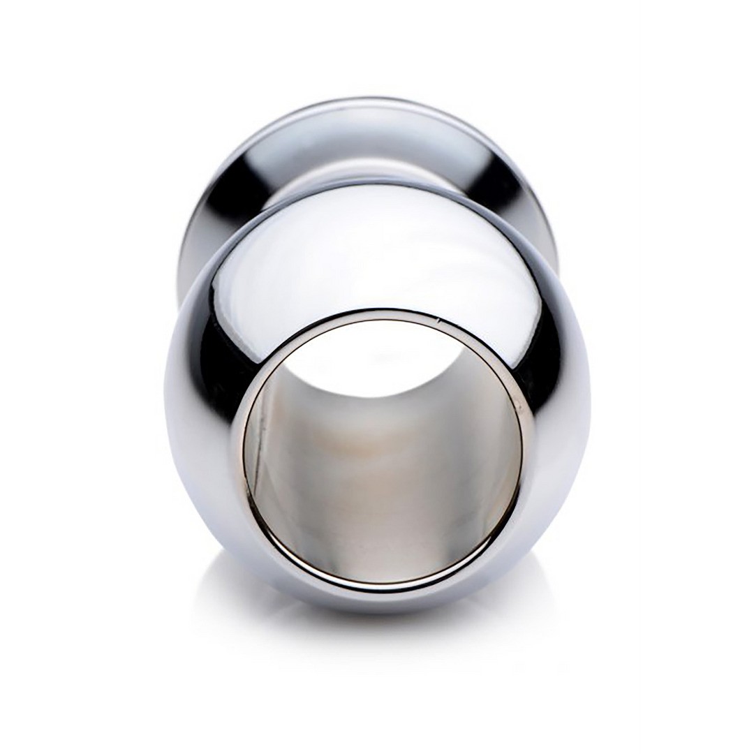 Plug anale cavo in metallo con tunnel per giochi di dilatazione e visualizzazione intensi.
