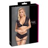 Top affascinante abbinato a un sofisticato perizoma senza cavallo, che forma un completo in pizzo nero di Cottelli LINGERIE. Entrambi i capi sono realizzati in morbido pizzo floreale elasticizzato, che garantisce un elevato comfort. Il top ha maniche corte e una profonda scollatura davanti e dietro, con un anello decorativo di strass sul davanti. Sul retro ha una fascia elastica regolabile e un gancio aggiuntivo per una vestibilità perfetta. Il perizoma a vita alta ha reggicalze regolabili sulle cosce e un design seducente senza cavallo.