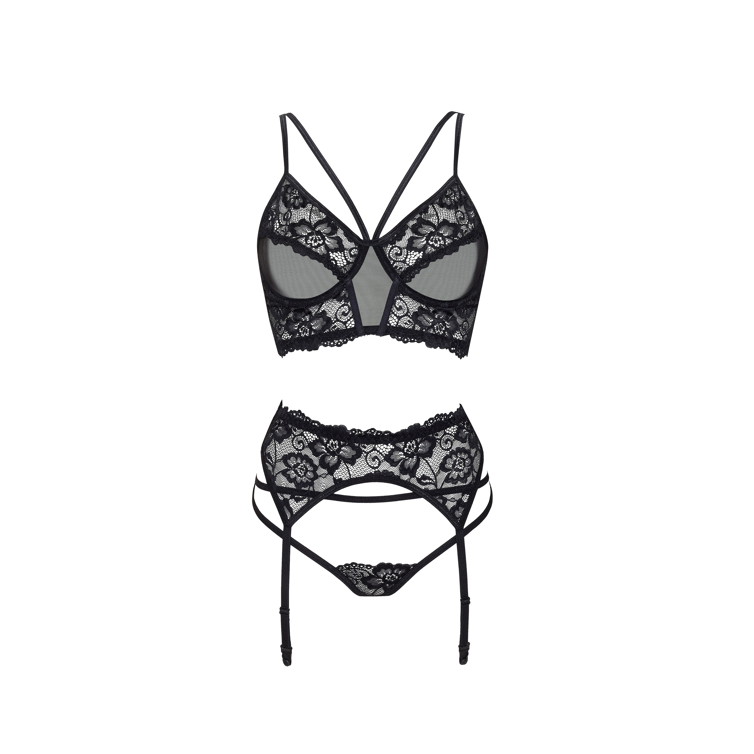 Sensuale set di lingerie a tre pezzi. Il reggiseno in splendido pizzo floreale ed elastico mette in risalto il seno grazie ai ferretti, mentre il delicato pizzo aggiunge un aspetto romantico.
