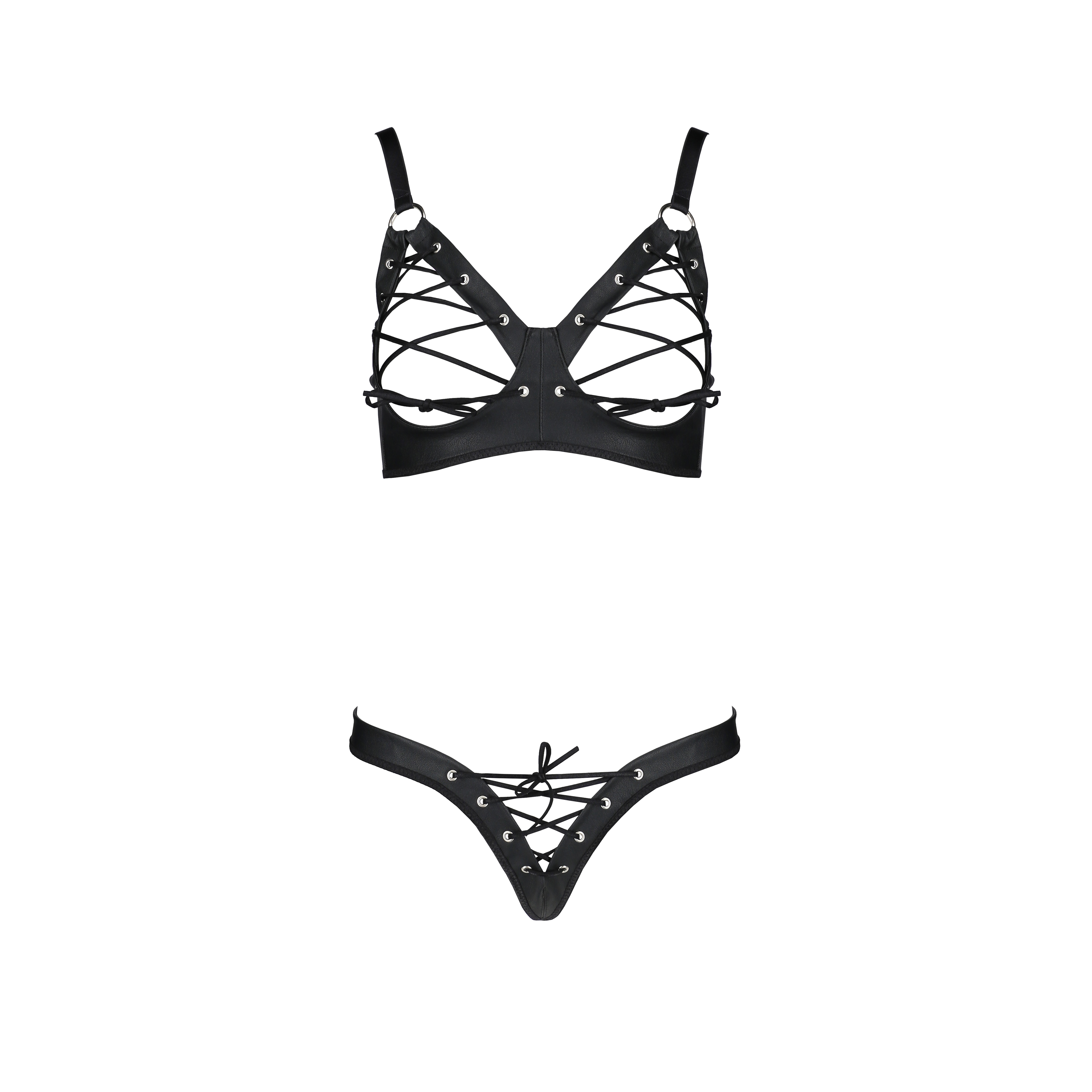 Il reggiseno aperto è strutturato con coppe rinforzate e ferretti, per un sostegno sicuro e una vestibilità perfetta. L'audace perizoma è dotato di lacci regolabili sui lati, per una vestibilità personalizzata che esalta le vostre curve.