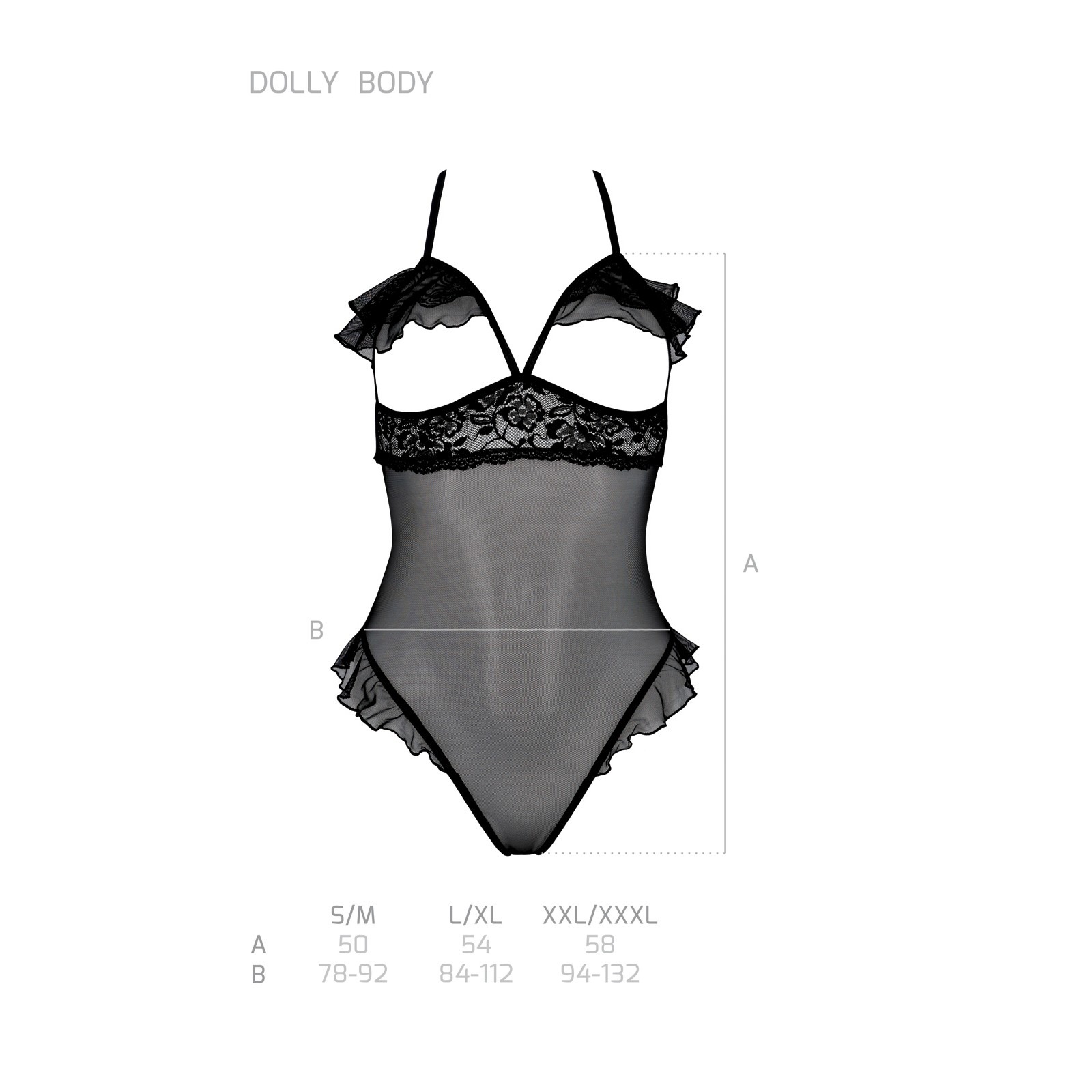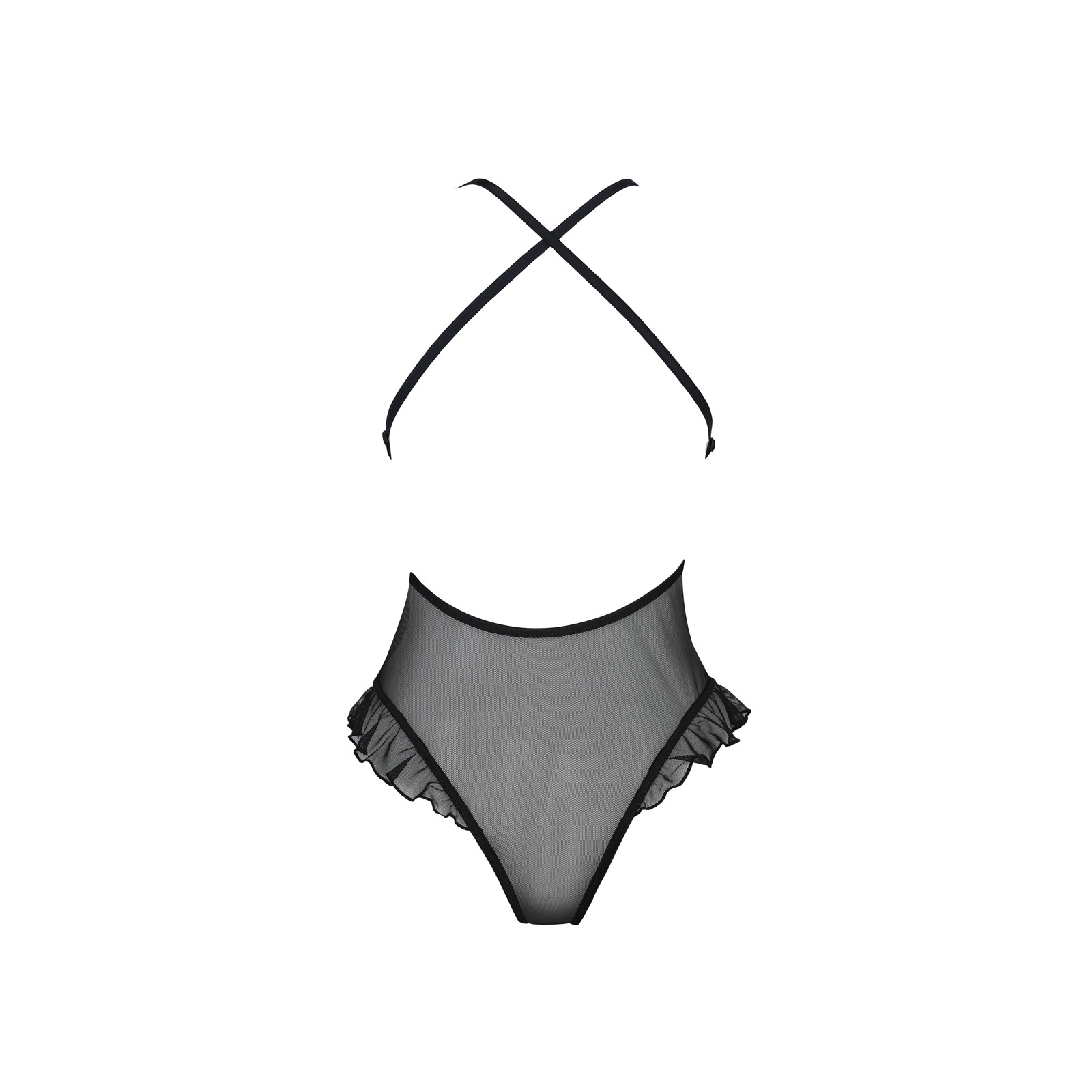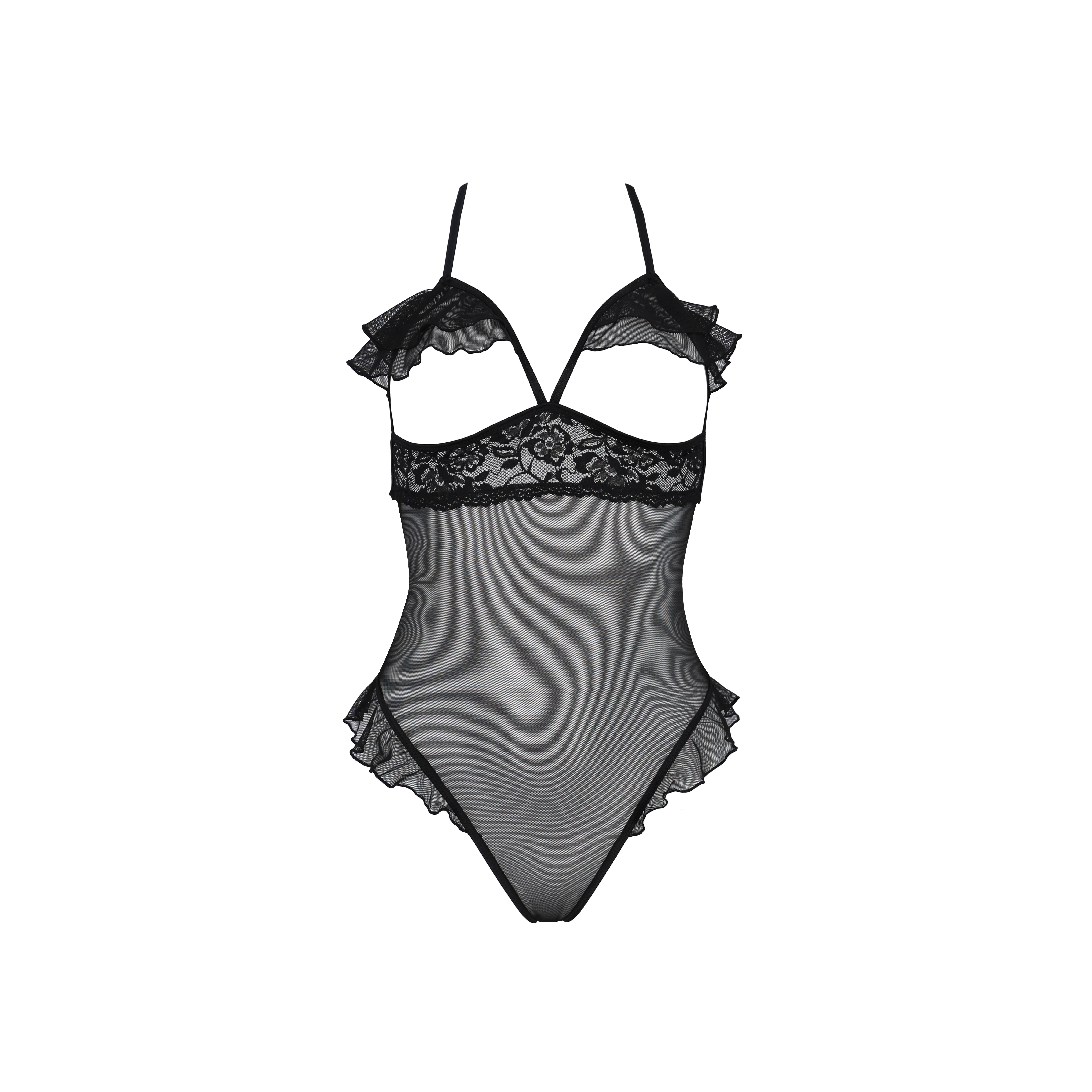 Body sensuale in tulle elasticizzato con dettagli in pizzo e volant che enfatizzano le curve femminili in modo sofisticato.