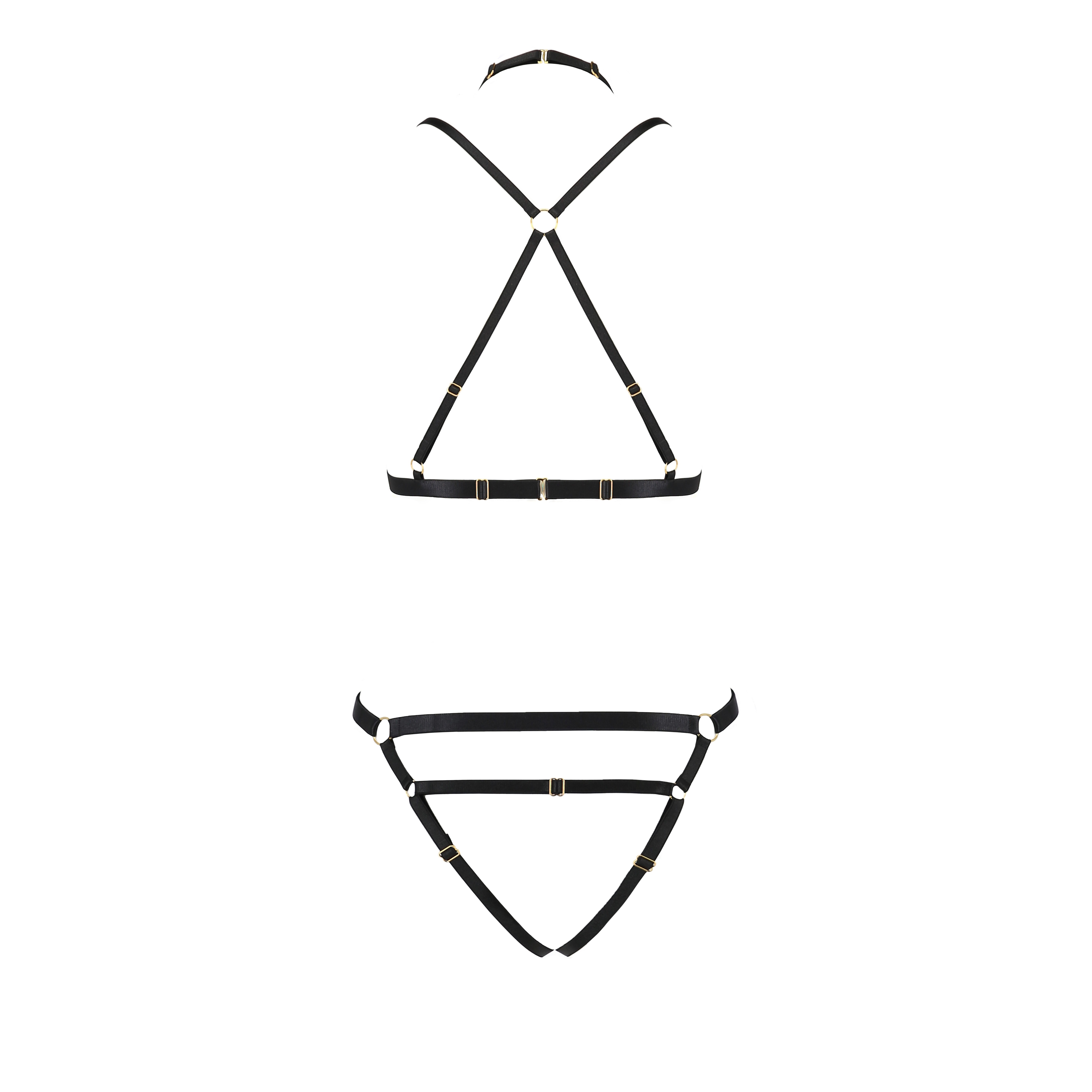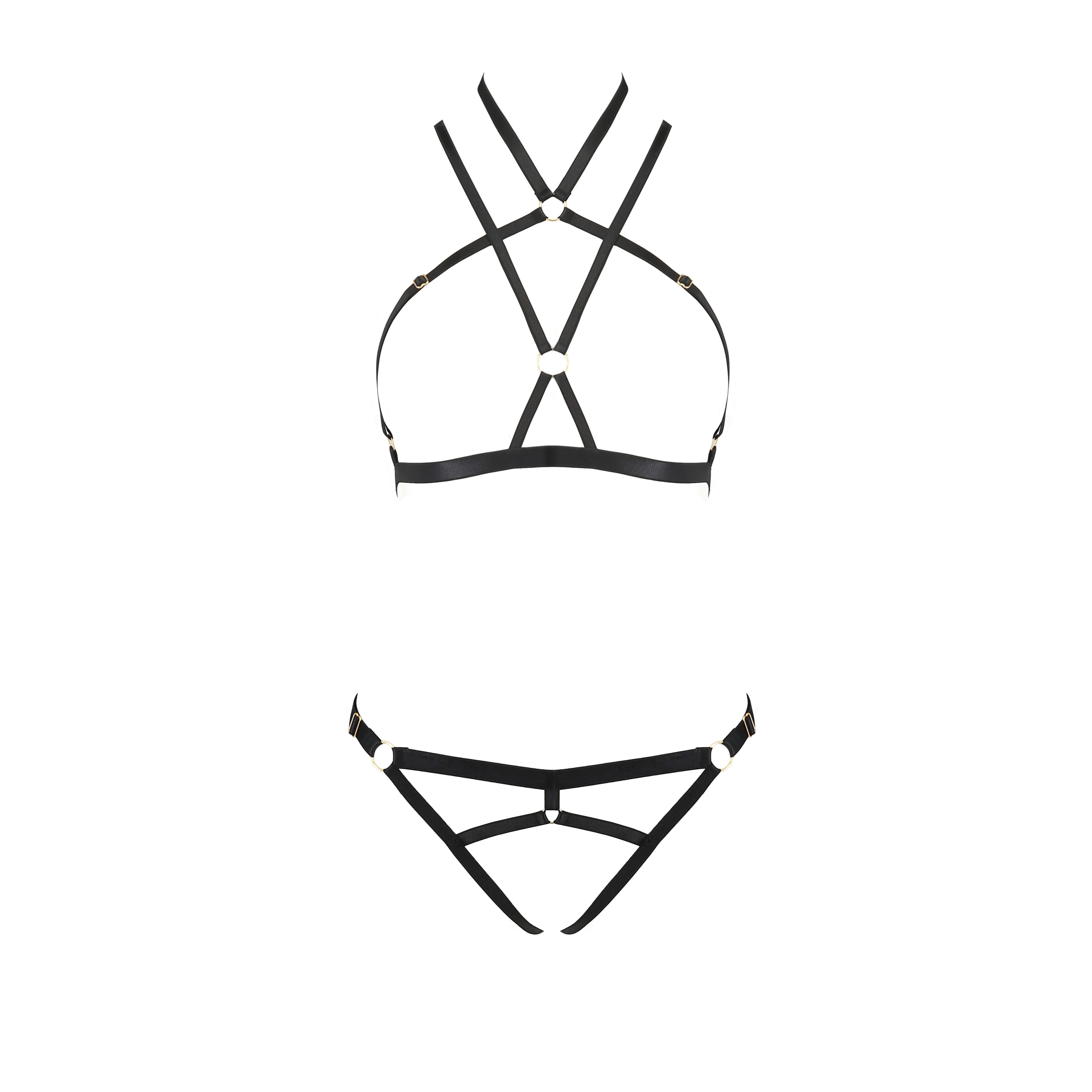 Composto da un reggiseno e da un perizoma, entrambi dal design aperto, questo set è perfetto per chi cerca audacia e raffinatezza in un unico capo.
