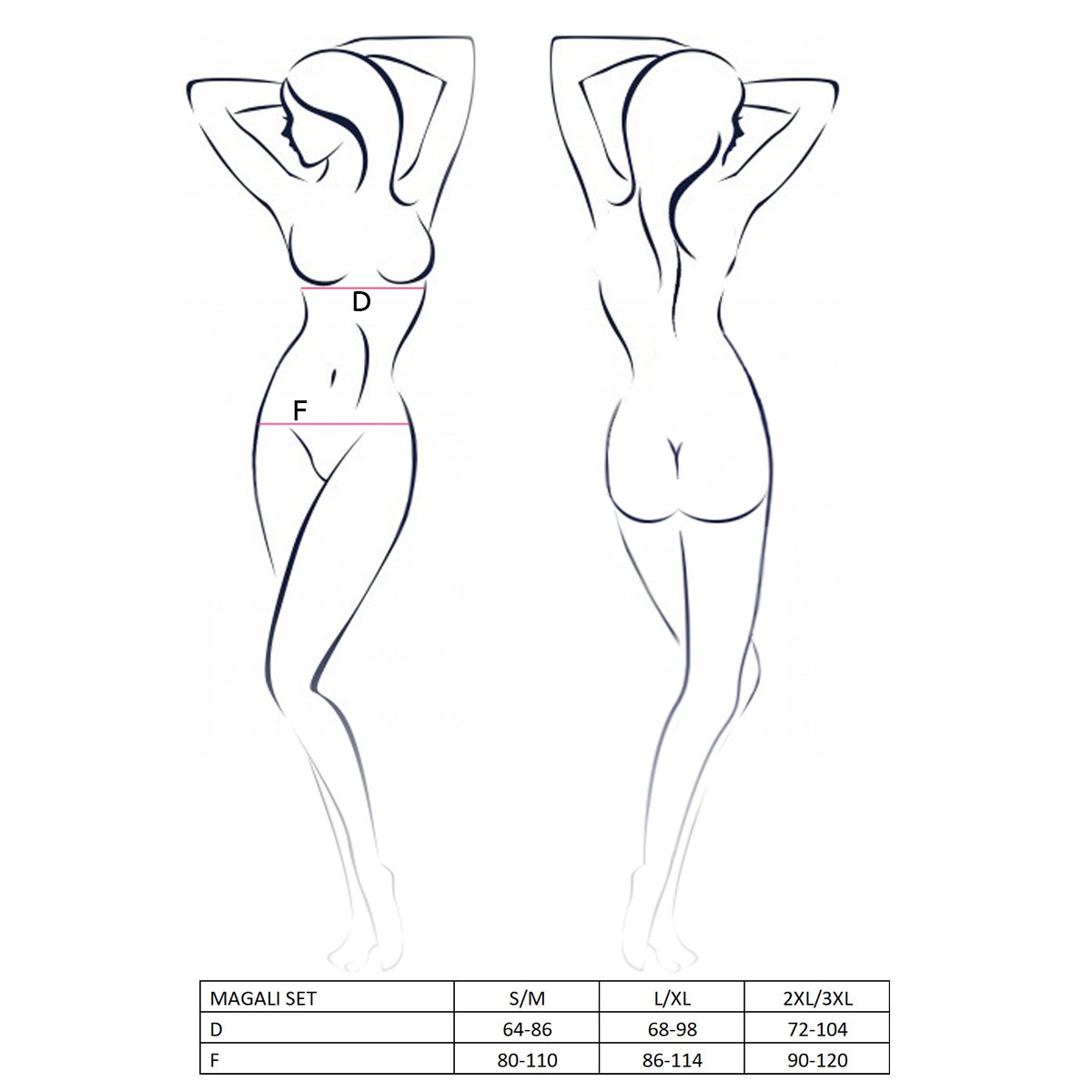 Il set tre pezzi Magali della linea Devil Collection di Passion è composto da un reggiseno aperto, un perizoma aperto e un reggicalze.